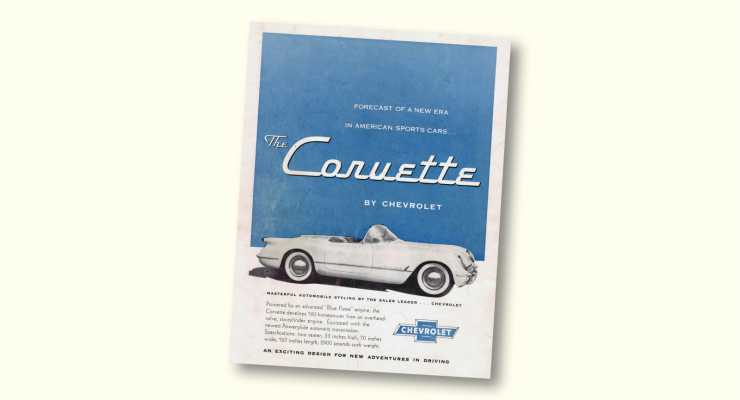 Här har vi en tidig annons för Chevrolets nya sportvagn Corvette årgång 1953. Projektet att ta fram modellen inleddes 1951 och motiverades av att åtskilliga soldater som återvände från kriget i Europa förde med sig europeiska sportvagnar.