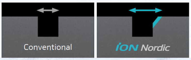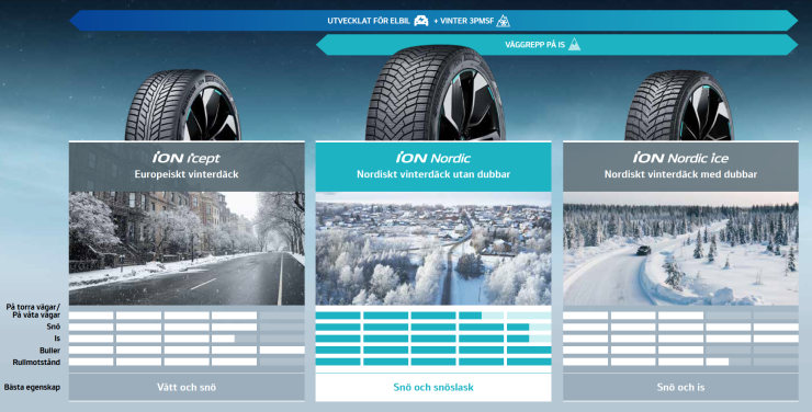 Hankook iON Nordic är konstruerat för att ge stabilitet på såväl snö och slask som is. Hemligheten ligger i en ny gummiblandning och täta lameller som ger kortare bromssträckor och bra acceleration, samtidigt som blockkonstruktionen bidrar till fin styrrespons även i kyla.