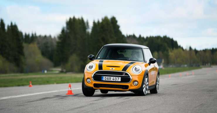 Helt nya Mini Cooper S är först ut i konbanan och förväntningarna är höga. Ska den charmerande gokartkänslan från förra och förrförra modellen finnas kvar? Jo, den nya går ”som trollet” mellan konerna, enligt ett förarprotokoll. På de kurviga vägarna till flygfältet var Mini rena carvingskidan att hantera, med fast och lite ”smörigt” sätt att röra sig. I konbanan förändras karaktären.