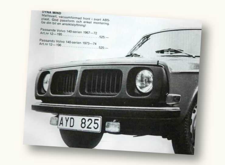 Inget frontalangrepp kom dock i närheten av det vi ser ovan: Dynamind-fronten till Volvo 140-serien. Den ritades ändå av en riktig designer och konstnär, den skicklige och internationellt välkände Sune Envall. Dynamind dök upp som prototyp på en projektbil för Teknikens Värld 1978, en grå Volvo 142 som för dyra pengar renoverades, lackerades i svart och guld och försågs med turbo. ”Hurtiggutten” kallades skapelsen och den säregna, glosögda fronten av ABS-plast tillverkades av AB PR-plast i Östersund.