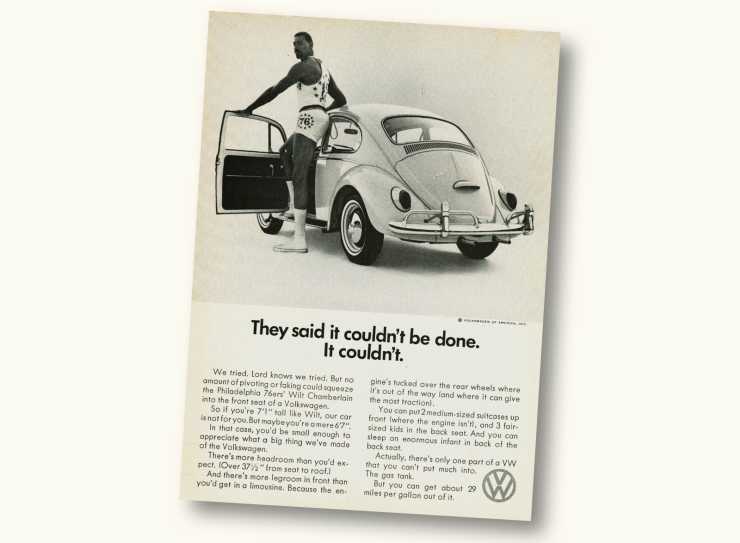 På Manhattan i New York satt samtidigt de nyskapande reklammakarna på byrån DDB (Doyle Dane Bernbach) och funderade på om inte Chamberlain borde göra reklam för Volkswagen. Skulle det gå att trycka in honom i en Bubbla av 1966 års modell?