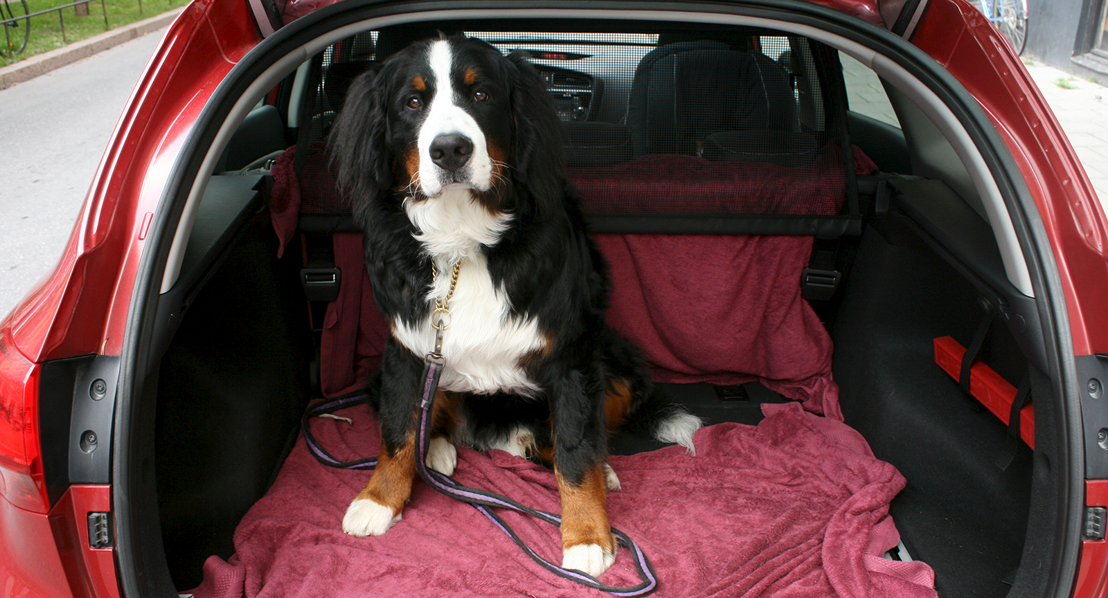 Jag skulle komplettera med sele och rem kopplad till en lastögla och så pass lång att hunden, om bagageluckan är öppen, kan stå på marken men inte springa i väg.