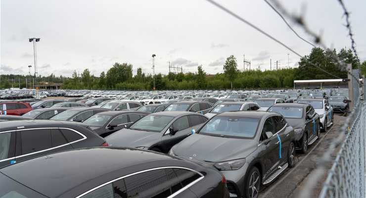 Fabriksnya bilar står uppställda i Södertälje hamn, i väntan på vidare transport.