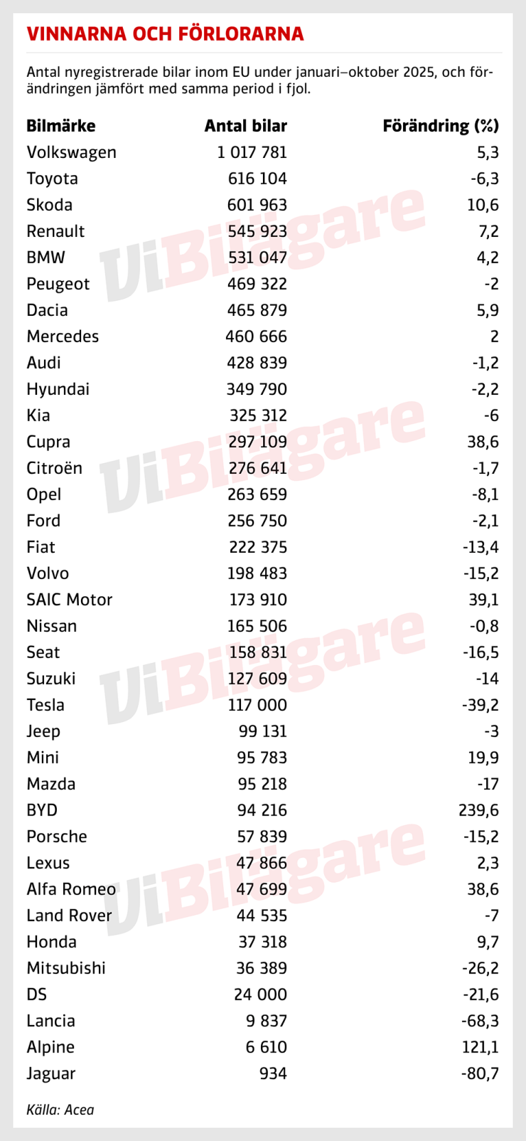 Två av de bilmärken som tappar mest är Volvo och Tesla, med 15 respektive 39 procent. Volvos försäljning har sjunkit flera månader i rad medan Teslas senaste ras nu gör märket mindre än exempelvis Suzuki och Nissan i EU.