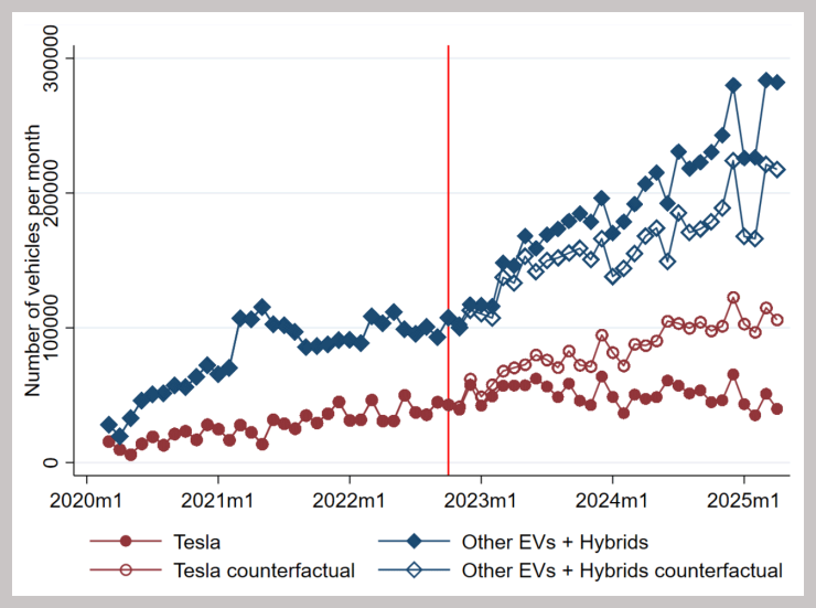 Utan den så kallade ”Elon Musk-effekten” skulle Teslas försäljning mellan oktober 2022 och april 2025 ha varit mellan 67 och 83 procent högre. Det motsvarar minst en miljon bilar, och kanske upp till 1,26 miljoner bilar – bara i USA.