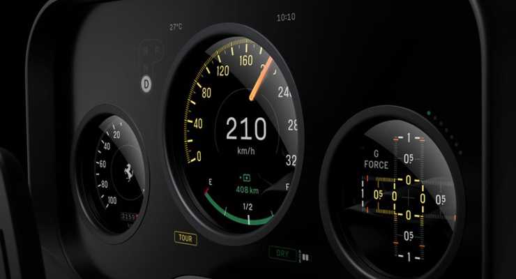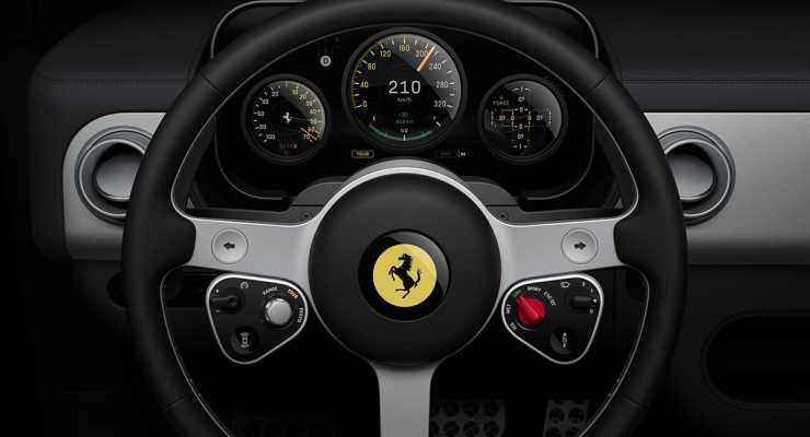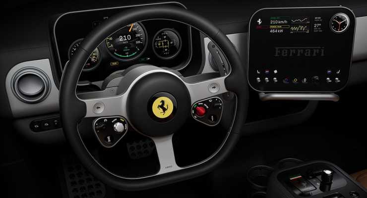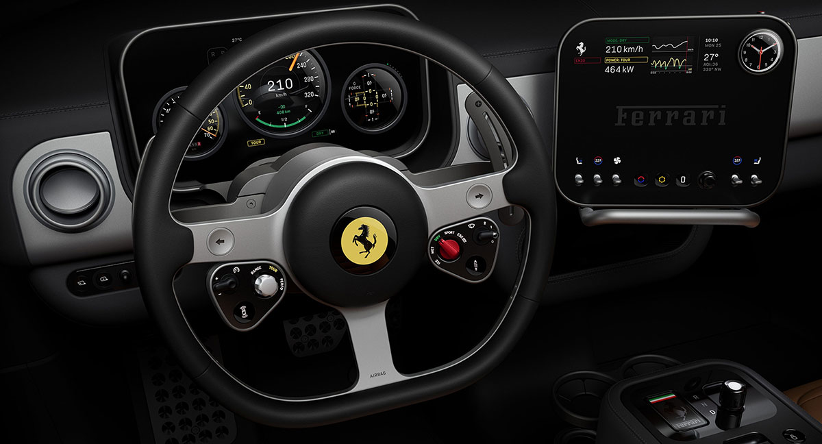 Mest uppmärksamhet har den tio tum stora pekskärmen fått. Dels är den betydligt mindre än i många andra nya bilar och dels går den att flytta med ett tjockt reglage. Det beskriver Ferraris designchef som unikt och banbrytande.