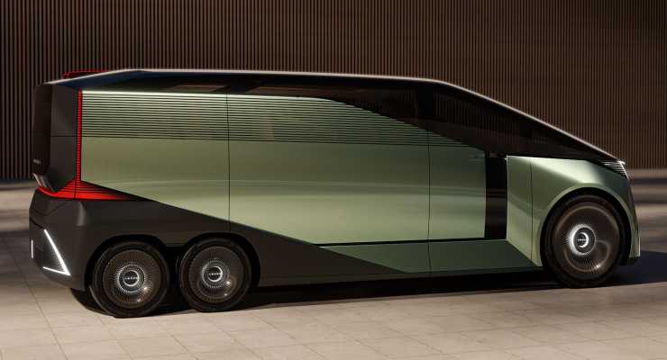 Lösningen med sex hjul ska ge bättre kupéutrymme eftersom hjulhusen inte inkräktar lika mycket. En automatisk skjutdörr öppnar upp en rymlig interiör med bekväma fåtöljer.
