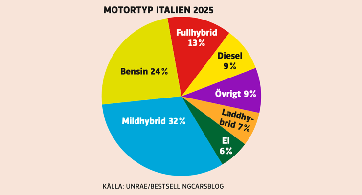 Bensinmotorer och mildhybrider stod för 57 procent av marknaden. Till 2026 har Italien sjösatt en elbilspremie, initierad av EU likt den i Sverige, med förhoppningen att skynda på den långsamma elektrifieringen i landet.