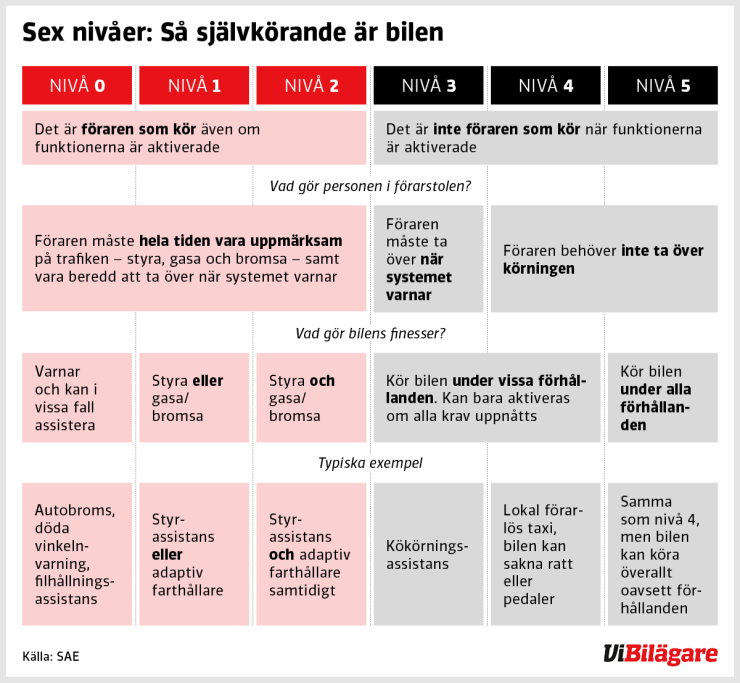 Nivå 3 innebär att föraren kan ta händerna från ratten och ögonen från vägen, men måste vara beredd att ta över. Biltillverkaren är ansvarig om något händer så länge systemet är aktiverat.