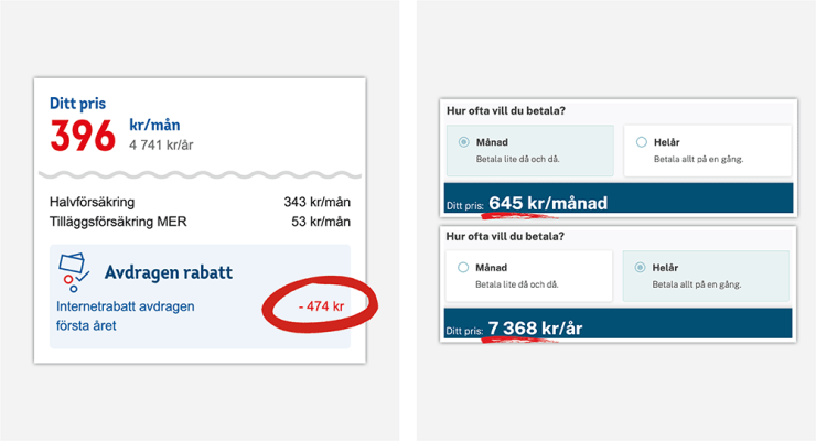 Ett knep är att visa kostnaden per månad, trots att försäkringen ofta tecknas för ett år. Priset framstår därför som lägre än i verkligheten. Däremot visas rabatten för ett helår, inte per månad, vilket i stället får rabatten att verka högre än i verkligheten.