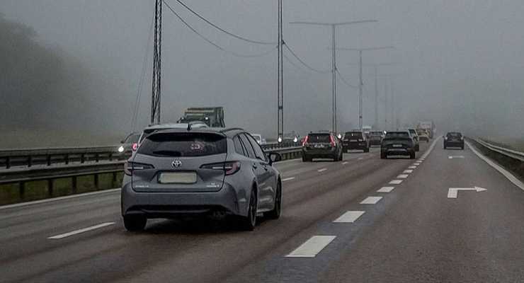 En ögonblicksbild från verkligheten där flera bilar har släckta bakljus trots gryningstid och nedsatt sikt.
