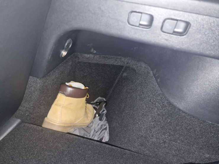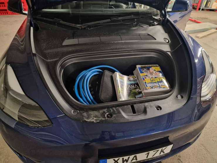 Tesla Model Y har dock djupa förvaringsfack på båda sidorna vid bakhjulen. Där ryms skorna och vill man undvika nedsmutsning funkar plastpåsar.