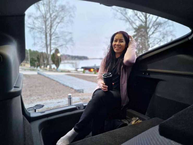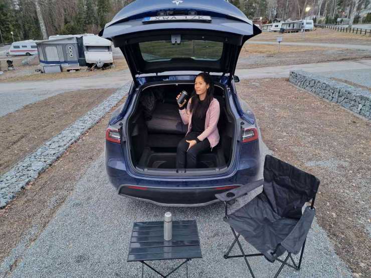 Men frågan är om Tesla själva insett hur bra sittplats Model Y har i bagagerummet? Vi stortrivs där bak med fötterna i trunken och den uppvikta madrassen och golvskivan som ryggstöd. Bakluckan leker markis och vi njuter en stund av utsikten över Mälaren. Inbyggd bakvänd soffa är väl ändå lite unikt?