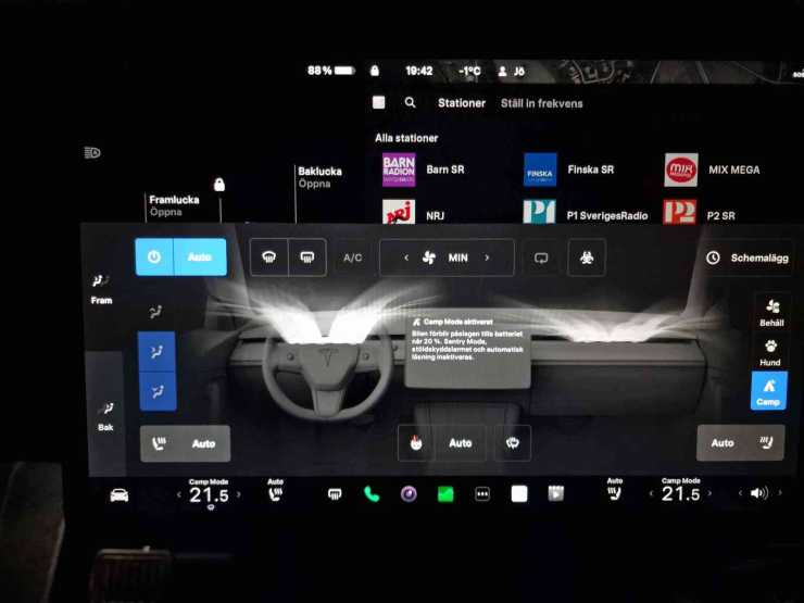 Hur klarade sig batteriet efter en hel natt på ”tomgång”? Vi startade Camp mode klockan 19:42 och då stod batteriet på 88 procent och det var –1°C utomhus och +23°C i bilen. När vi vaknade klockan 05:33 hade batteriet sjunkit till 63 procent och det var aningen för varmt i bilen hela natten då jag ställt tempen på 23,5 grader. Det betyder dryga 20 mils kvarvarande räckvidd i Model Y med bakhjulsdrift i nollgradigt väder.
