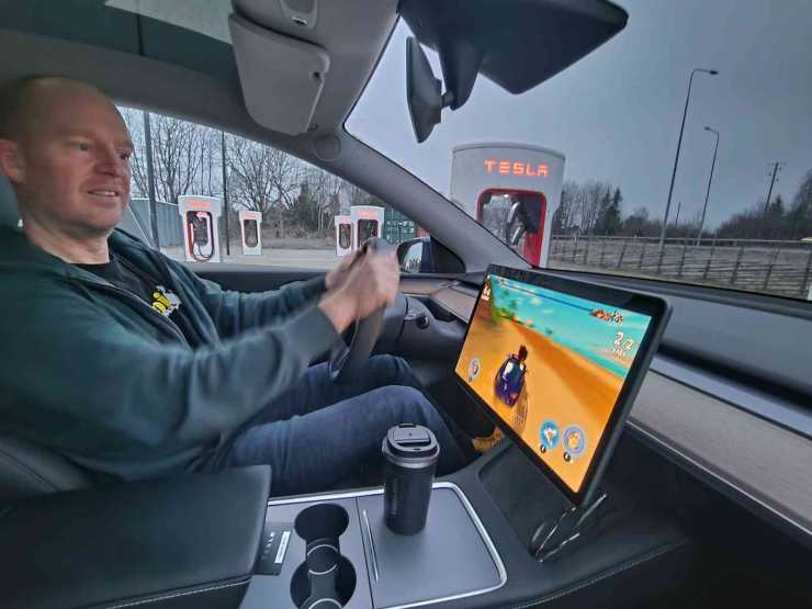 Vår tur går runt Mälaren och det är gråa mars och därmed nollgradigt eller några minusgrader. Vi stannar ett par gånger för att ladda trots att det inte behövs. Dels vill vi ha full kräm inför campingnatten utan elstolpe, och dels är det småkul med laddstopp. Snabbladdaren påminner nämligen lite om en ställplats och på bilens skärm kan vi kolla på Youtube och Netflix.