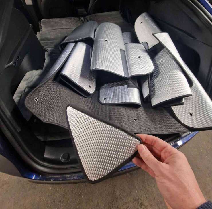 På övriga fönster har vi insynsskydd med tunn isolering. Vi saknade dock sugproppar så den sluttande bakrutan och takfönstret förblev nakna natten igenom. Till alla övriga fönster kunde de formsydda skydden klämmas fast enkelt utan sugproppar.