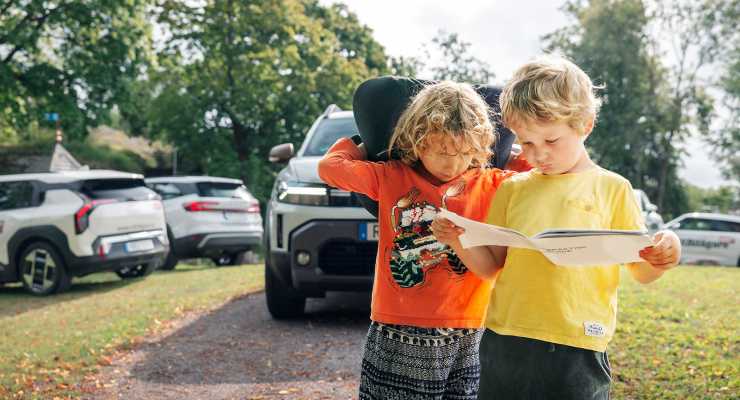 Hur och var ska man sitta egentligen? Testlagets juniorsektion med Lou Hamelius, 5 år, och Eddie Andersson, 4 år, slår sina kloka huvuden ihop och försöker förstå vad biltillverkarna menar.