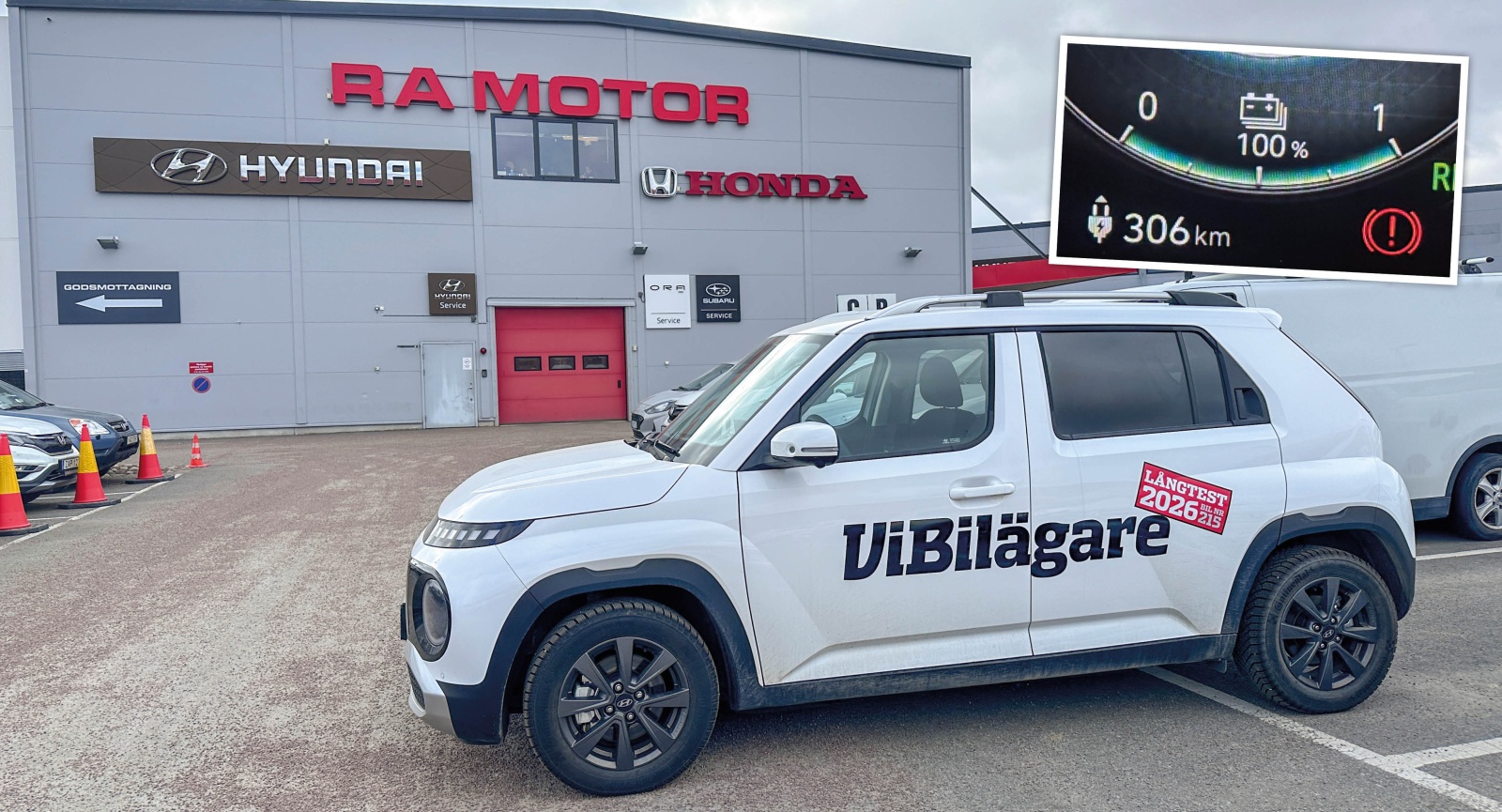 Det såg ut som vi skulle få köra med 60 procents räckvidd i minst en månad men efter en vecka hörde RA Motor i Haninge av sig igen och erbjöd fri lånebil tills vår bil var lagad. Man ordnade också transporten av bilen till verkstaden i Uppsala.