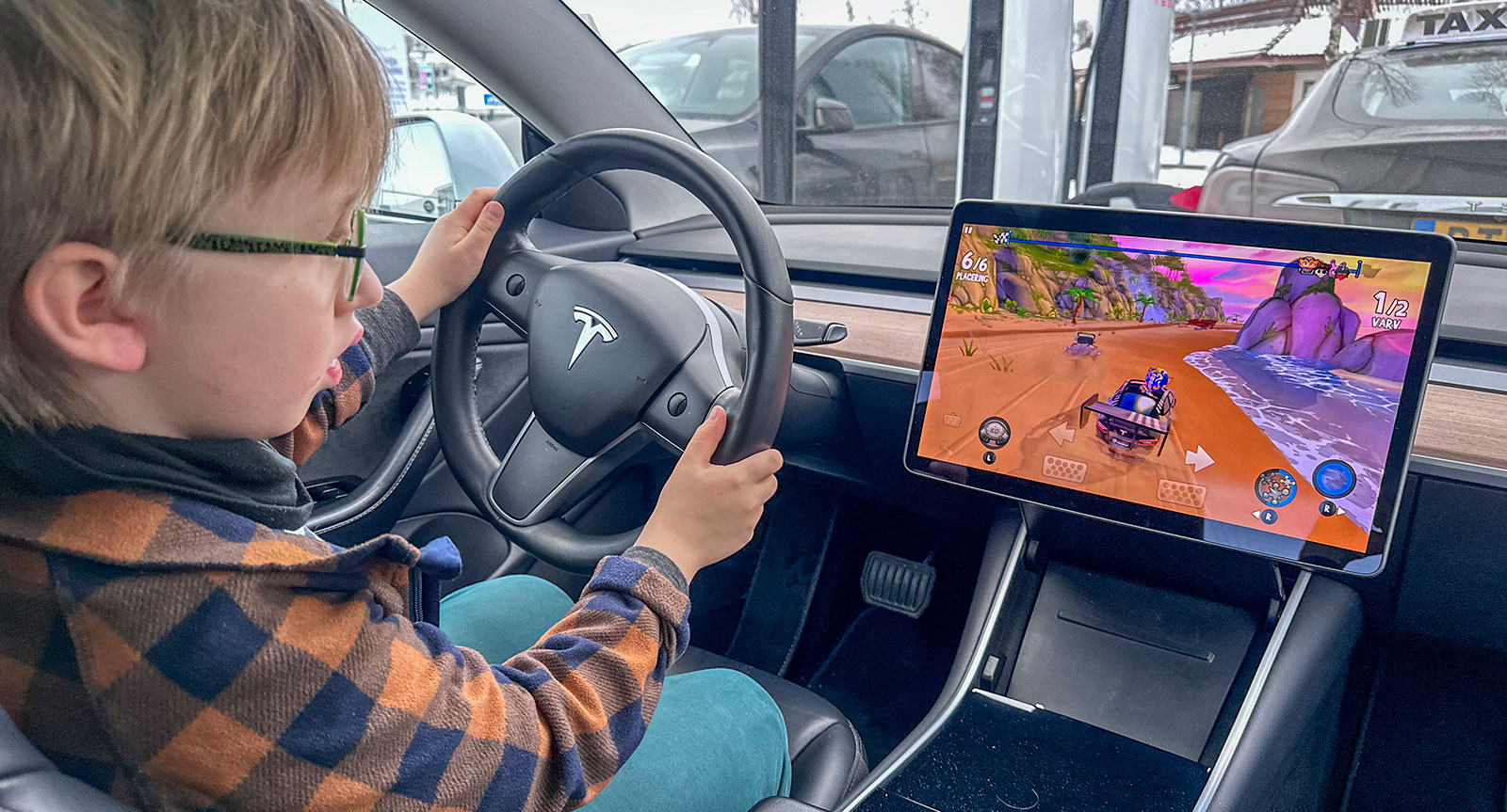 Även efter sex år sticker vår Tesla Model 3 ut – och inte bara på ett bra sätt. Barnen gillar i alla fall spelmöjligheterna.