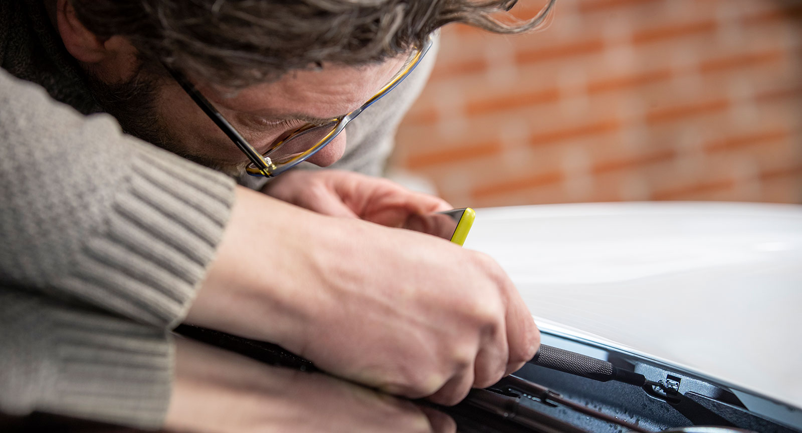 Långtestförare i färd med att justera vinkeln på vindrutans spolarmunstycken. De sitter en bit in under motorhuven och är svåra att se.