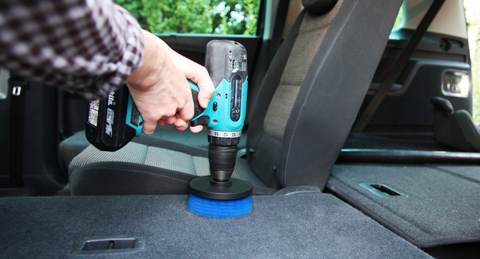 Roterande borstar som kan sättas direkt i skruvdragaren piskar upp smuts ur textil på ett sätt som en dammsugare inte klarar på egen hand.